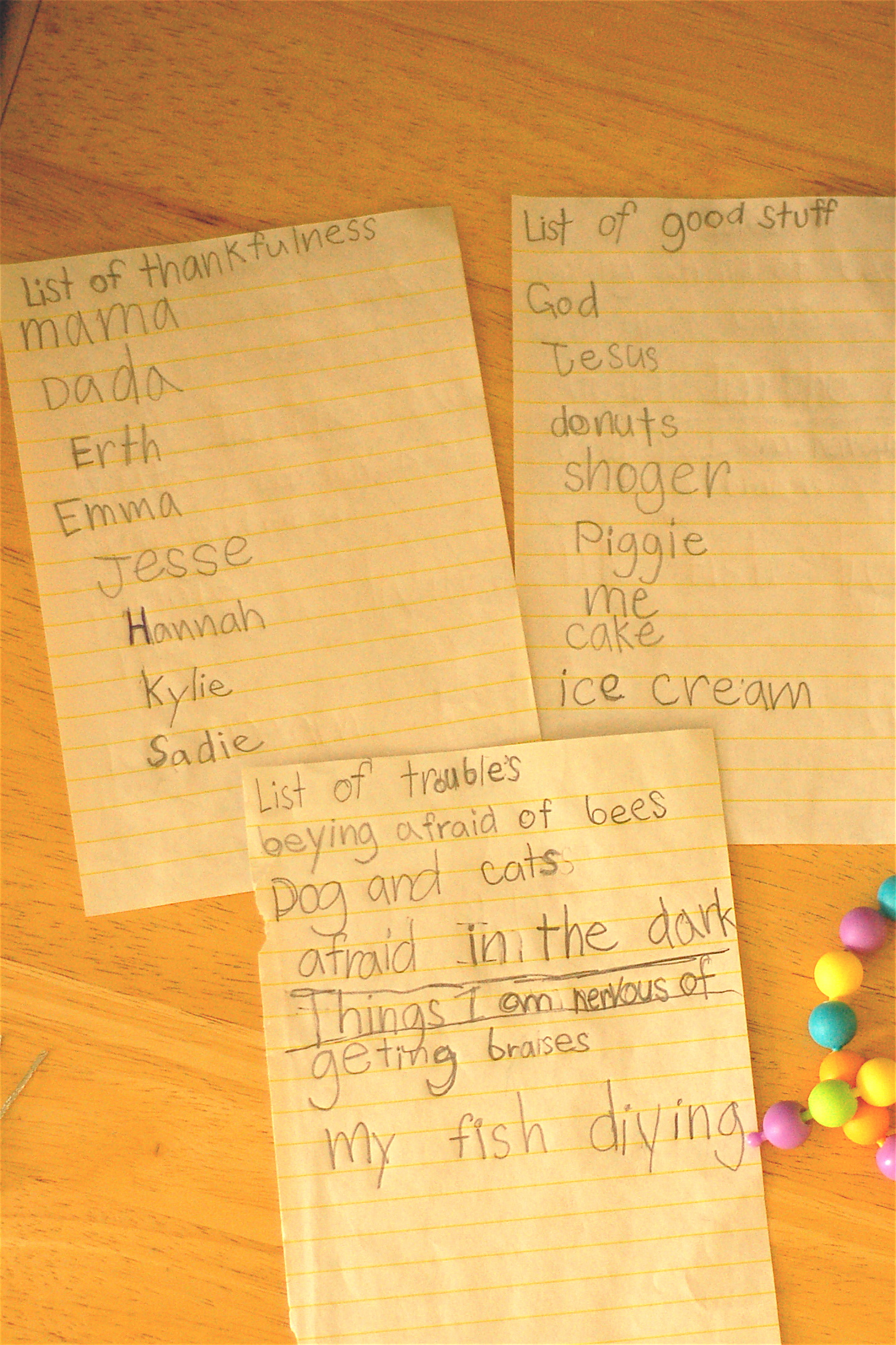 Speaking of Ava- she is growing into quite the little lady. It’s been so neat to watch the love of Christ shine through her this year and to see her grow in her relationship with the Lord. She challenges me daily with her giving heart (I will type more about that later!) . She is really growing up. Recently I found some lists that she had made, catagorized by “Good Stuff,” “Thankfulness,” and “Troubles and Things Nervous Of.” I would like to note that I am #1 for thankfulness! Whoohoo! It does feel great to be appreciated. And who can argue with the list of “good stuff” when there are things like God, Jesus, donuts, and ice cream. I am still unsure what “Shoger” is? Kroger? Sugar? My bet is Sugar knowing this girl! Poor girl is worried about braces and her fish dying. I should probably be cleaning that fish bowl more often!